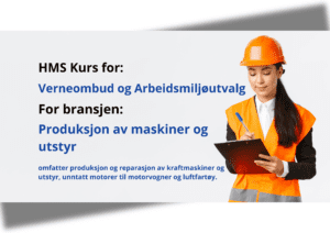 Dette kurset er bransjespesifikt for Produksjon av maskiner og utstyr. Bransjen omfatter produksjon og reparasjon av kraftmaskiner og utstyr, unntatt motorer til motorvogner og luftfartøy.